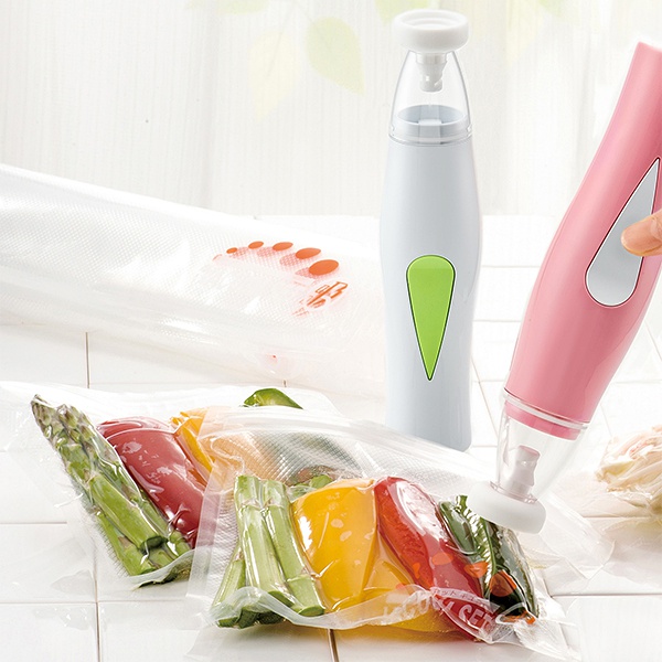専用の密封パックに食材を入れ、バキューマーで脱気状態にすることで食材の酸化を抑えます。電池式のコンパクトサイズ。密封パックのサイズはS・M・Lの3種類で、洗えば繰り返し使用が可能。
